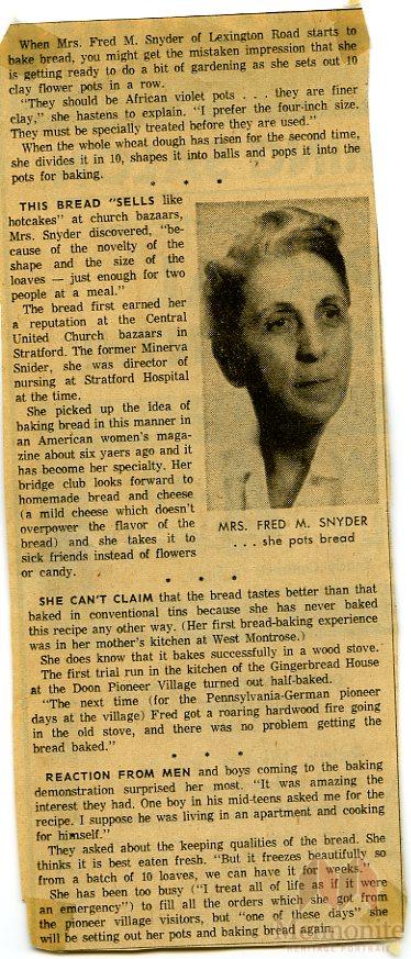 Keywords Fred M. Snyder, Minerva Snider, bake, baking, bread, pots, clay, bazaars, Stratford, hospital, nurse,