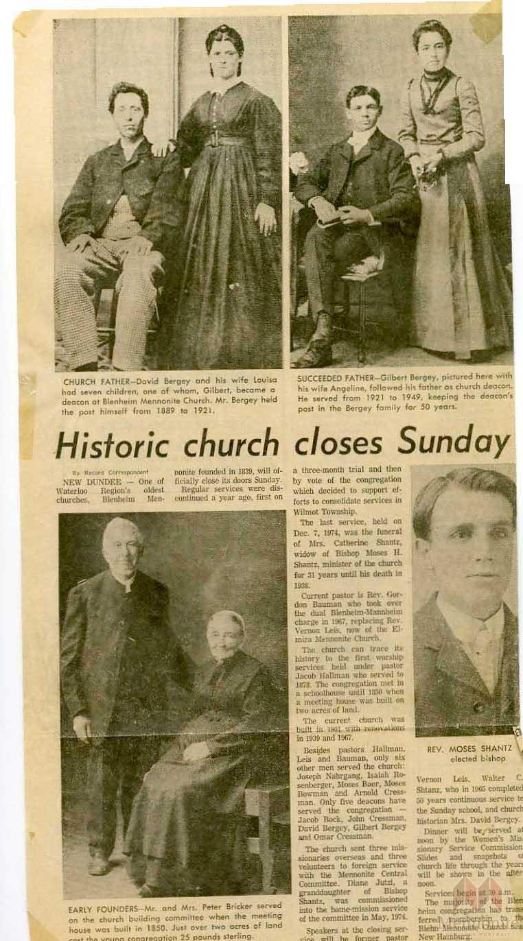 Keywords Blenheim, congregation, Biehn Mennonite Church, Blenheim Mennonite, New Dundee, Mrs. Catherine Shantz, Bishop Moses H. Shantz, Rev. Gordon Bauman, Rev. Vernon Leis, Joseph Nahrgang, Isaiah Rosenberger, Moses Baer, Moses Bowman, Arnold Cressman, Jacob Bock, John Cressman, David Bergey, Gilbert Bergey, Omar Cressman,