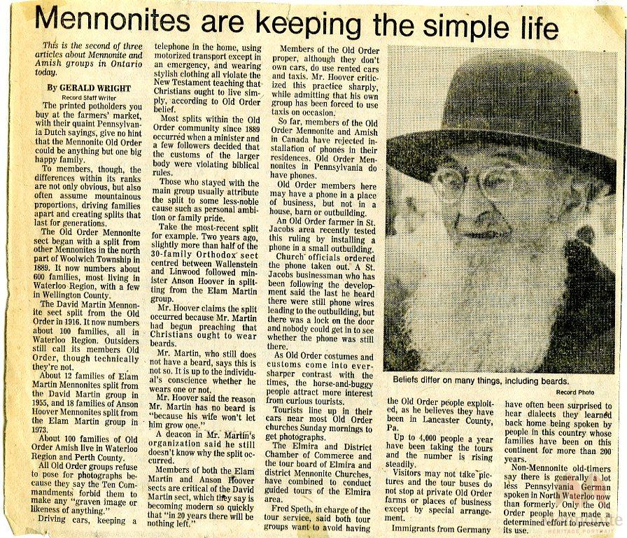 Keywords Old Order, Mennonite, split, divisions, families, tourism, tourists, Amish, beards, Woolwich Township, David Martin, Elam Martin, Anson Hoover, rules, law, Bible,