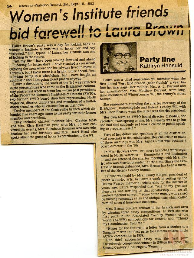 Keywords Laura Brown, WI, Women’s Institute, Federated Women’s Institutes of Ontario, Mrs. Clayton Moss, Mrs. Elsie Kaufman, Mrs. Jo Box, Mrs. Elizabeth Bowman, Associated Country Women of the World, essays,