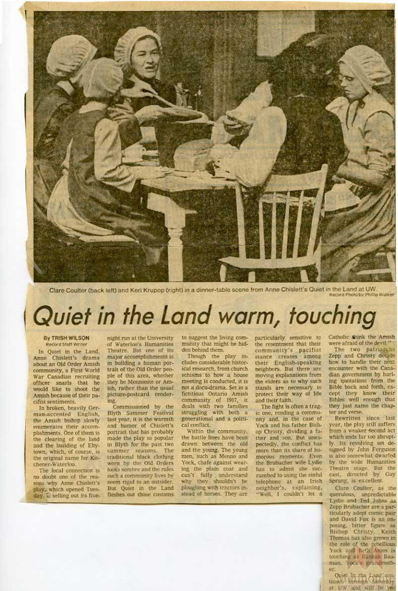 Keywords Quiet in the Land, play, theater, Clare Coulter, Keri Krupop, Anne Chislett, Old Order Amish, story, Humanities Theatre, Menno, Yock, Bishop Christy, Brubacher,