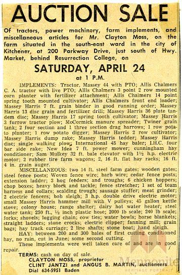 Keywords sale, auction, farm, Clayton Moss, proprietor, Clint Jantzi, Angus B. Martin, auctioneer, Baden,