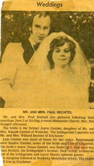 Keywords Wedding, Mrs. Paul Bechtel, Mr. Paul Bechtel, Joyce Gimbel, Stirling Avenue Mennonite Church, Rev. Ron Rempel, Ronald Gimbel, Willard Bechtel, Lois Gimbel, Sandra Gimbel, Cheryl Gringerich, Susan Gimbel, Ross Bechtel, Dan Ulrich, Kitchener,