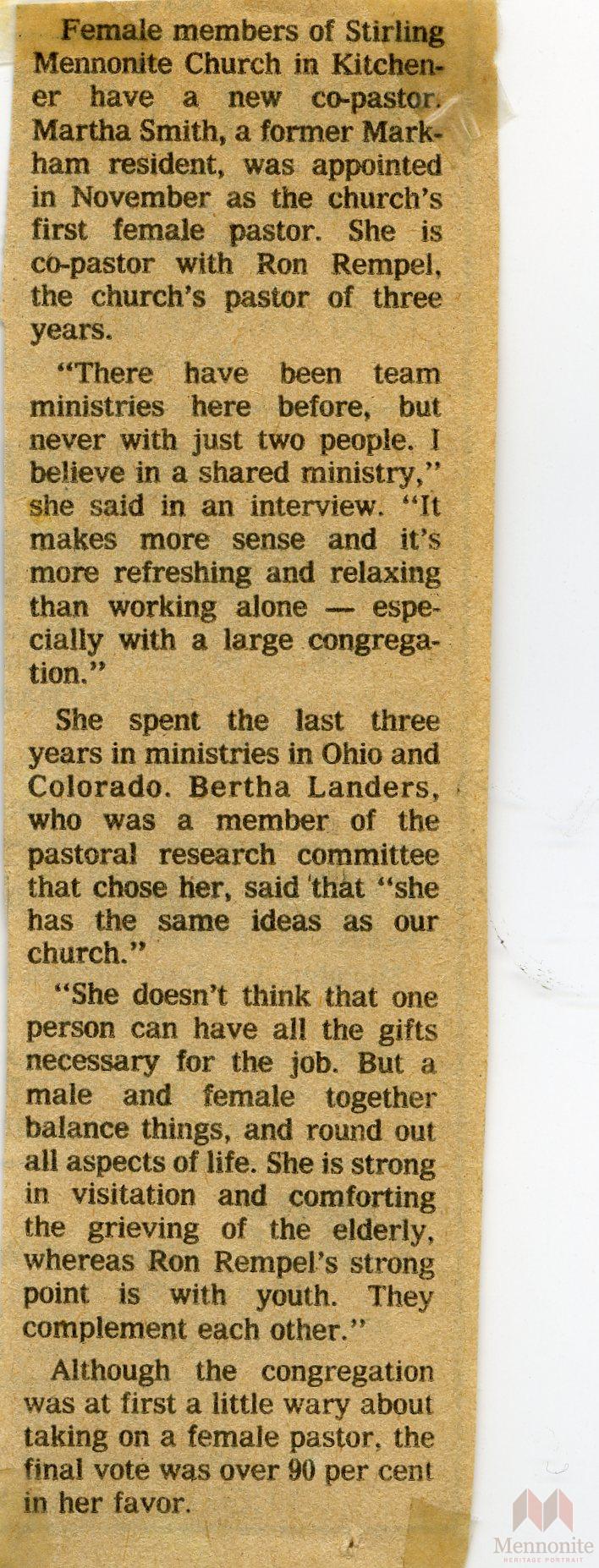 Keywords Stirling Mennonite Church, Kitchener, pastor, Martha Smith, Ron Rempel, female