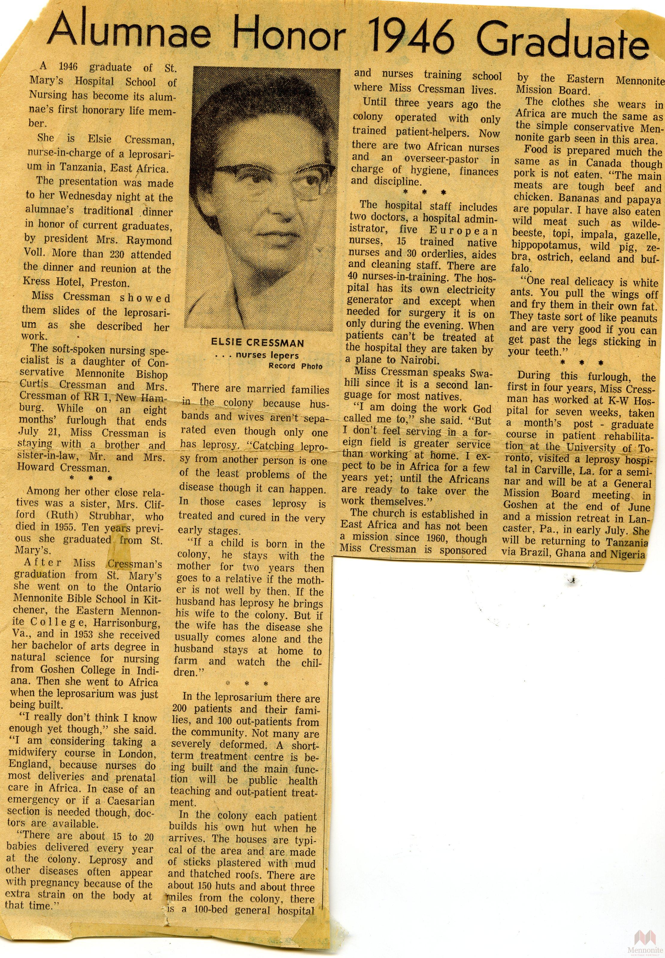 Keywords 1946, graduate, Elsie Cressman, nurse, lepers, leprosarium, Tanzania, East Africa, Mrs. Raymond Voll, Conservative Mennonite Bishop Curtis Cressman, Mrs. Cressman, Howard Cressman, Mrs. Clifford (Ruth) Strubher, St. Mary’s, Ontario Mennonite Bible School, Kitchener, Eastern Mennonite College, Harrisonburg, Va., Goshen College, Swahili,