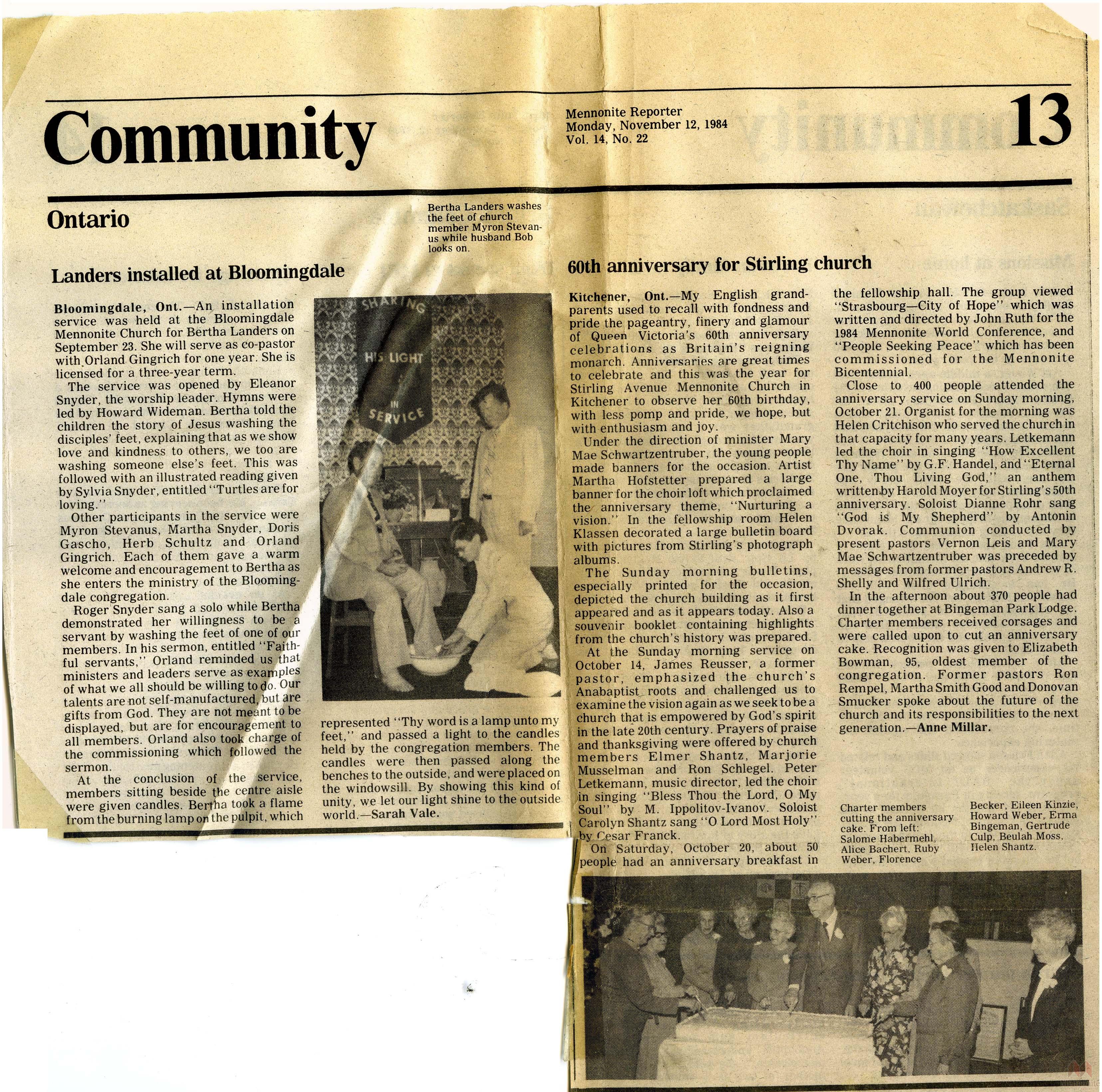 Keywords Bertha Landers, Bob Landers, Myron Stevanus, Bloomingdale, Bloomingdale Mennonite Church, co-pastor, Orland Gingerich, Eleanor Snyder, Howard Wideman, wash, feet, Martha Snyder, Doris Gascho, Herb Schultz, Roger Snyder, Salome Habermehl, Alice Bachert, Ruby Weber, Florence Becker, Eilenn Kinzie, Howrd Weber, Erma Bingeman, Gertrude Culp, Beulah Moss, Helen Shantz, anniversary, Stirling Avenue Mennonite Church, 60th,