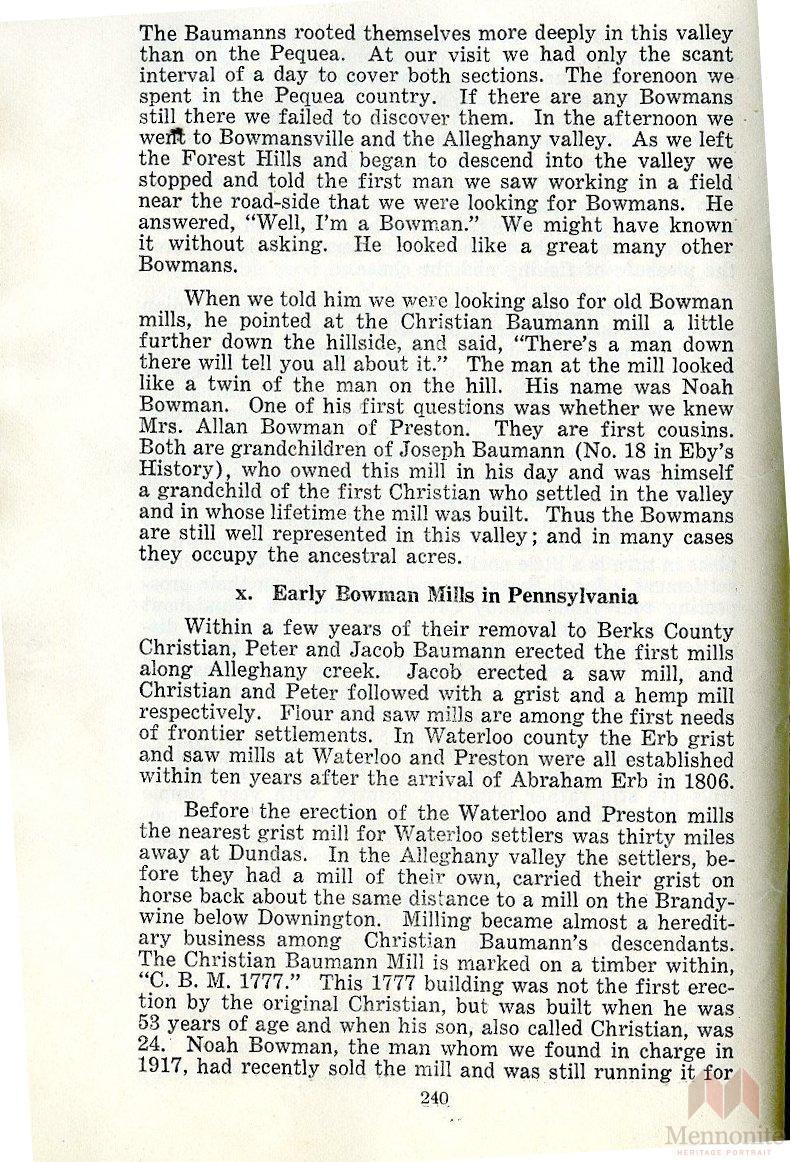 Keywords Baumann, Baumanns, Pequea, Bowmans, Bowman, Bowmansville, Alleghany, Alleghany valley, Forest Hills, Bowman mills, Christian Baumann mill, Noah Bowman, Mrs. Allan Bowman, Preston, grandchildren, Joseph Baumann, Eby's History 18, Pennsylvania, Berks County, Christian Baumann, Peter Baumann, Jacob Baumann, saw mill, grist mill, hemp mill, flour mill, saw mill, Waterloo county, Erb grist mill, Erb saw mill, Abraham Erb, Dundas, Brandywine, Downington, Christian Baumann Jr.
