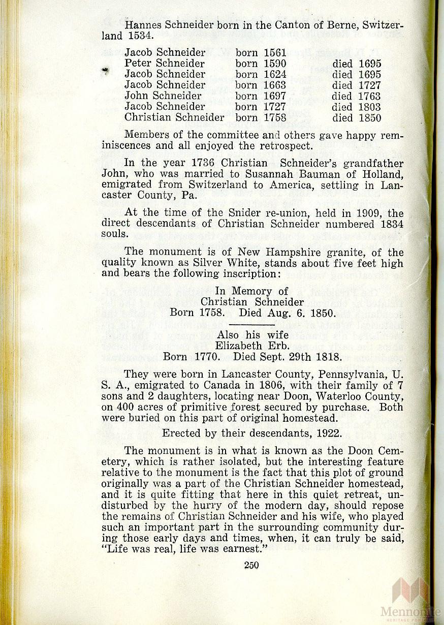 Keywords genealogical table, Hannes Schneider, Canton of Berne, Switzerland, Jacob Schneider, Peter Scnheider, John Schneider, Christian Schnieder, Susanna Bauman, Holland, America, Lancaster County, Pennsylvania, New Hampshire, white, inscription, Elizabeth Erb, Doon, Waterloo County, homestead, original homestead