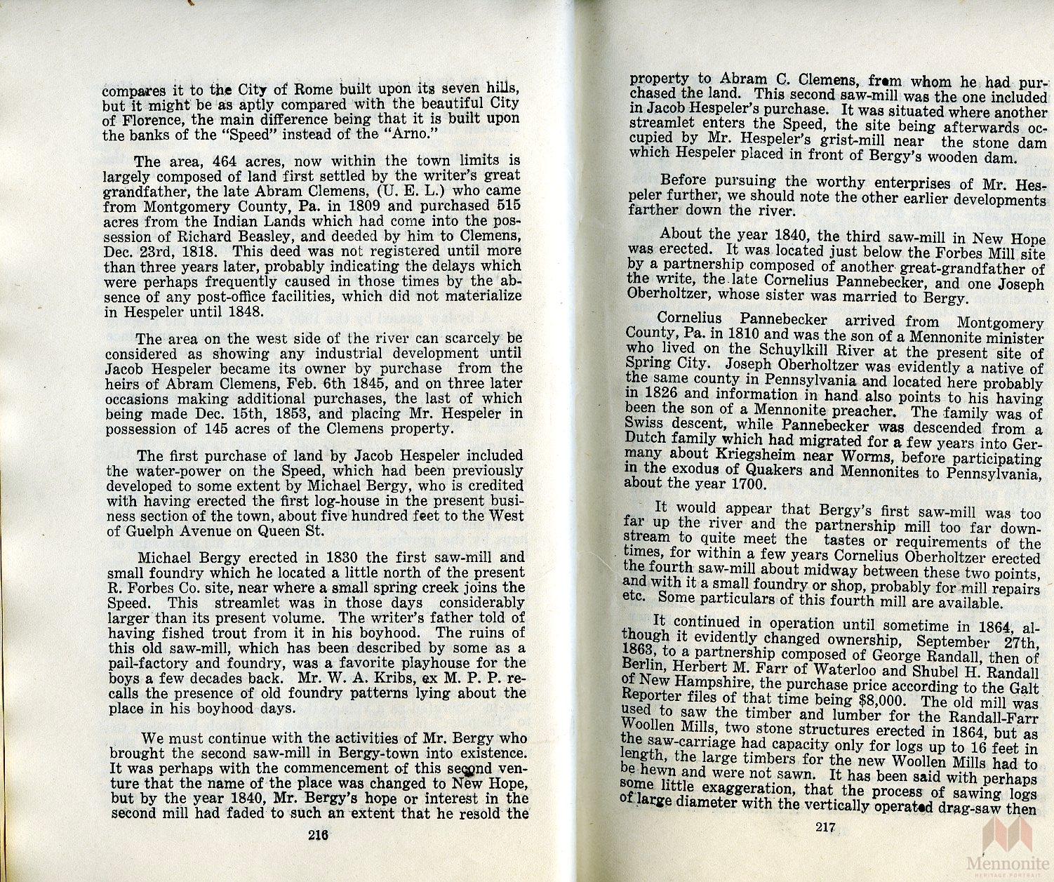 Keywords Speed River, 464 acres, Abram Clemens, Montgomery County, Indian Lands, Richard Beasley, Hespeler, Jacob Hespeler, water power, Michael Bergy, first log-house, Guelph Avenue, Queen Street, saw mill, foundry, R. Forbes Co., R. Forbes Company, pail factory, W. A. Kribs, M. P. P., Bergytown, New Hope, Abram C. Clemens, grist mill, stone dam, Forbes Mill, Cornelius Pannebecker, Joseph Oberholtzer, Montgomery County, Schuylkill River, Spring City, Pennsylvania, Swiss, Dutch, Kriegaheim, Worms, Quakers, Mennonites, George Randall, Berlin, Herbert M. Farr, Waterloo, Shubel H. Randall, New Hampshire, Galt Reporter, Randall-Farr Woolen Mills