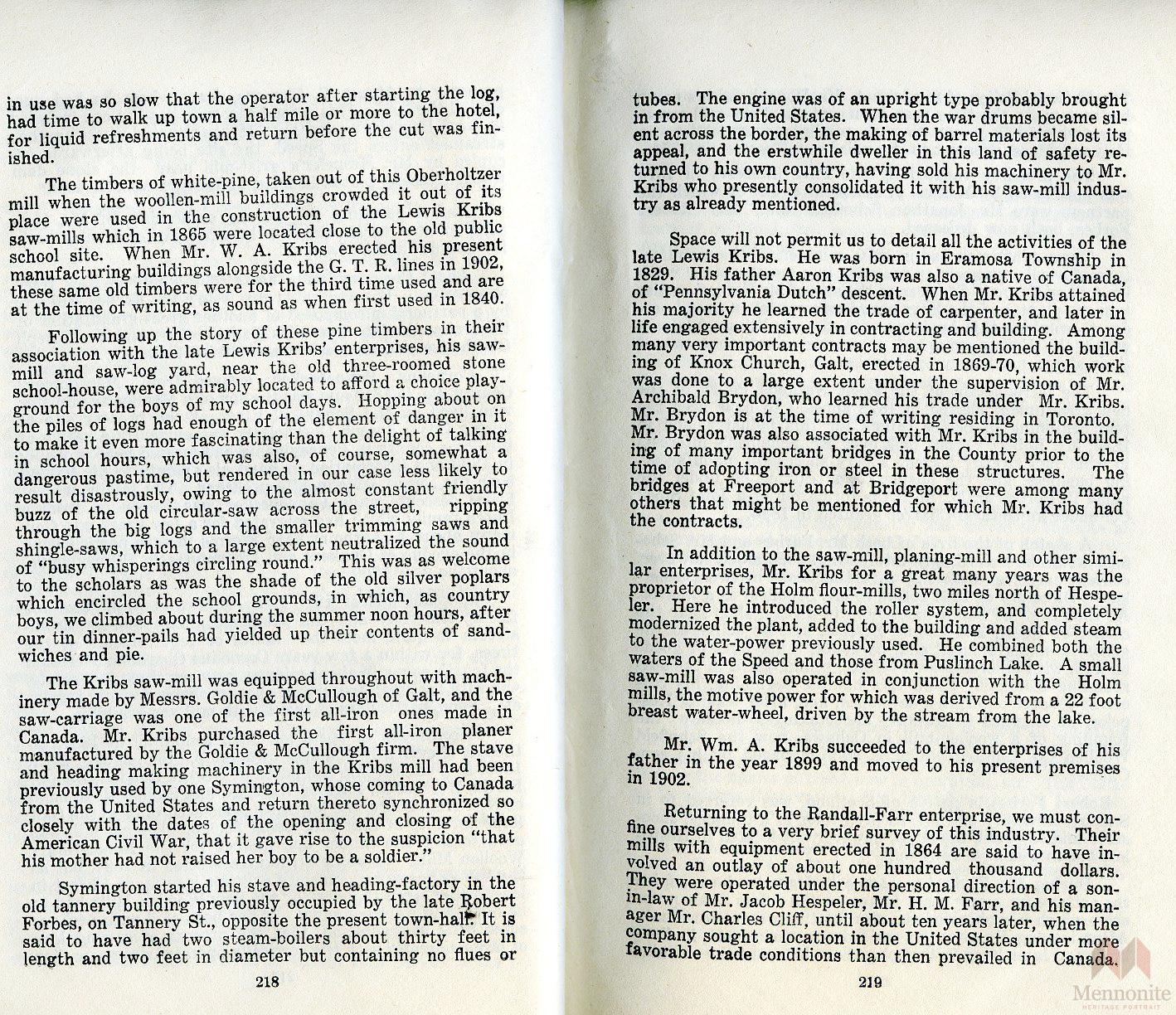 Keywords timbers, hewn, saw mill, white pine, Oberholtzer mill, woolen mill, Lewis Kribs, public school site, W. A. Kribs, Grand Trunk Railway, stone school house, Goldie, McCullough, Galt, iron saw carriage, iron planner, Symington, American Civil War, tannery building, Robert Forbes, Tannery Street, town hall, steam boilers, Eramosa Township, Aaron Kribs, Pennsylvania Dutch, carpenter, Knox Church, Galt, Archibald Brydon, bridges, Freeport, Bridgeport, planning mill, Holm Flour Mills, roller system, steam, water power, Pushlinch Lake, Holm Mills, water wheel, William A. Kribs, Jacob Hespeler, H. M. Farr, Charles Cliff