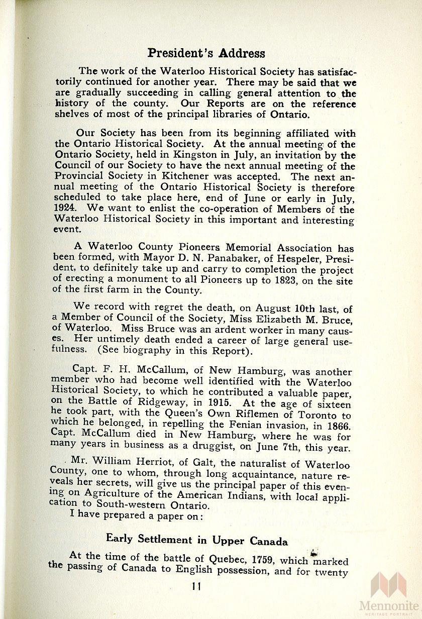 Accession Data Eleventh Annual Report of the Waterloo Historical Society, 1923, pages 11 - 17.