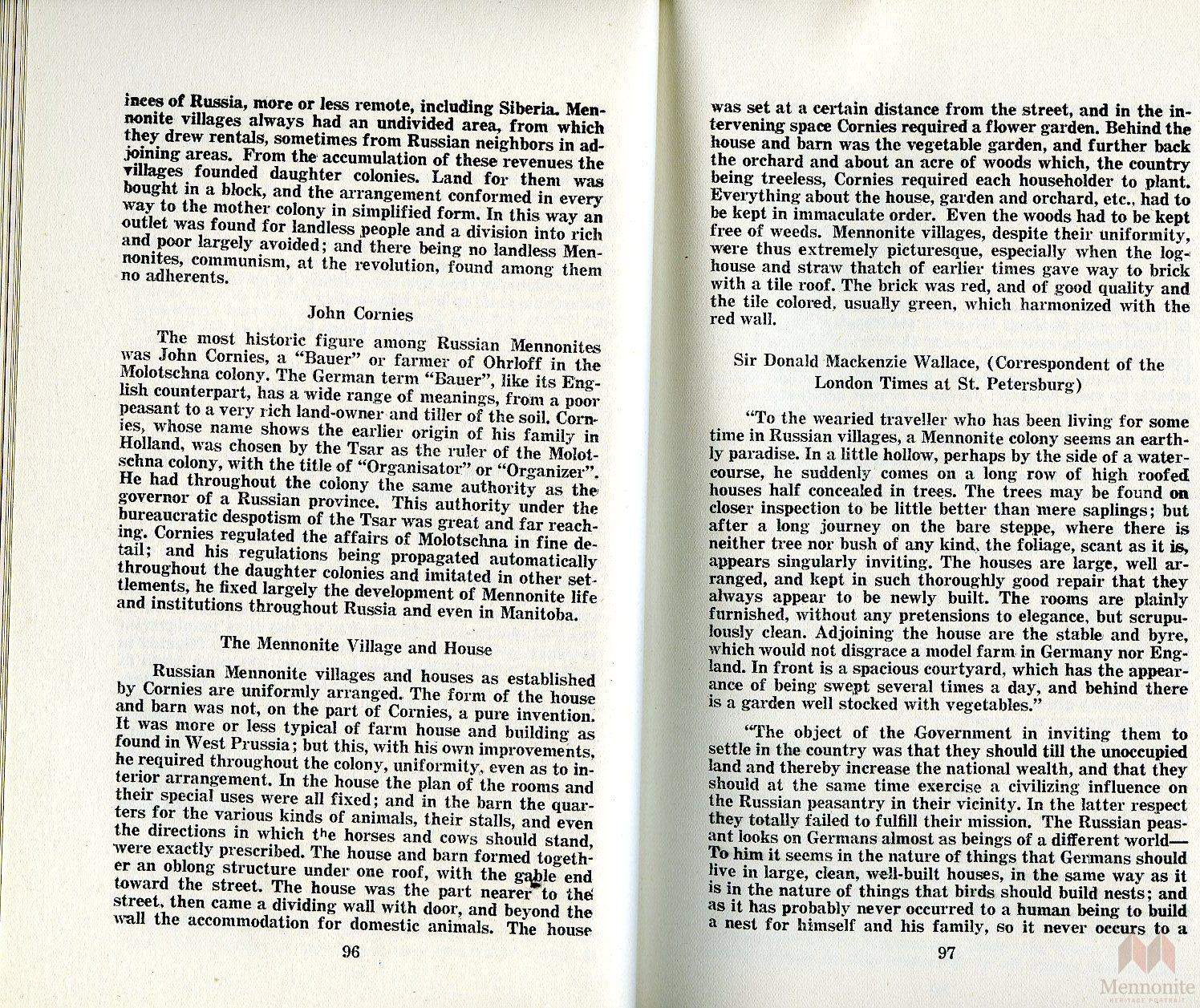 Keywords Russia, Siberia, Mennonite, villages, mother colony, communism, John Cornies, Bauer, farmer, Ohrloff, Moltschna, peasant, land owner, Holland, Tsar, colony, Organisator, Organizer, governor, daughter colonies, homes, house, farm, west Prussia, structure, layout, architecture, garden, flowers, vegetables, orchard, woods, forest, log-house, straw thatch, brick, tile, Sir Donald Mackenzie Wallace, London Times, Correspondent, St. Petersburg, letter